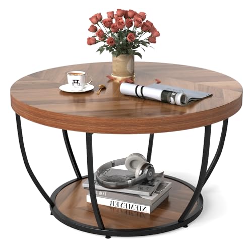 Tribesigns Runt bord, 2 nivåer industriell modern cocktail soffbord med hyllor, trä cirkulärt vardagsrumsbord soffbord med metallben för vardagsrum