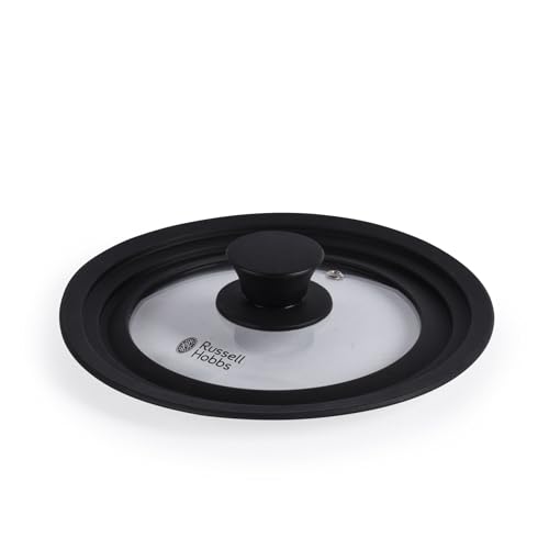 Russell Hobbs universellt kastrulllock – härdat glas med ångventil, passar 16 cm, 18 cm, 20 cm pannor och smarta klämmor, grytset, platsbesparande köksredskap, mjuk beröring, stannar sval silikon,