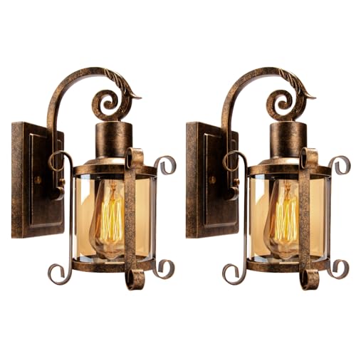 Plfann Rustik inomhusbärnstensglas vägglampa 2-pack borstad brons, industriell veranda lampa vardagsrum utomhus (utan glödlampa)