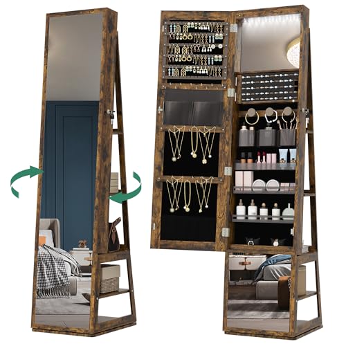 Hzuaneri smyckesskåp, med 360° vridbar bas, låsbar spegel i full längd, stora 4-stegs förvaringsfack, 4-i-1 multifunktionell, rustik brun JC16003X