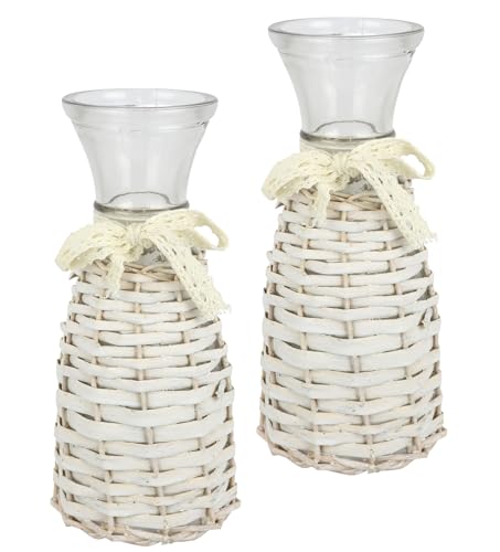 Dekorativ glasvas med flätad korgdesign och spets – vintage blomvas i lantlig stil – dekorativ vas rustik bordsdekoration för vardagsrum, kök eller bröllop, set om 2, 21 cm, vit