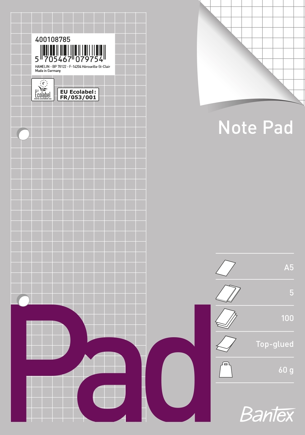 Häftat block Bantex A6 rutat 5st/fp