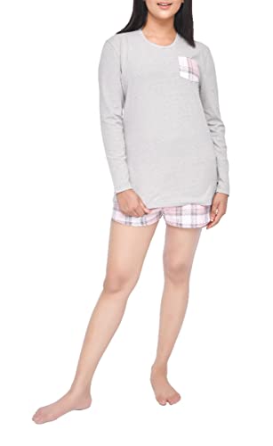 Reliwel Dampyjamas, lång, av bomull, rutig pyjamas för kvinnor, tvådelad, nattkläder, långärmad tröja och rutiga pyjamasbyxor med fickor, sovkläder, fritidsoverall för höst och vinter, GRÅ, L