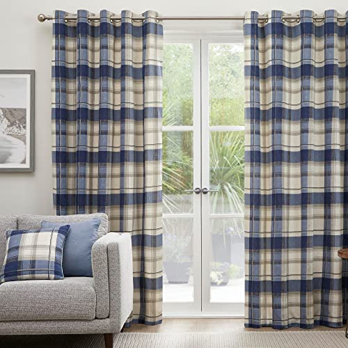 Fusion – blå tartan gardiner B 66 x L 54 (168 x 137 cm) – 100% bomull – 2 x paneler – safirblå rutiga gardiner – blå öljettgardiner i rutigt mönster – mörkblå gardiner för vardagsrum/sovrum