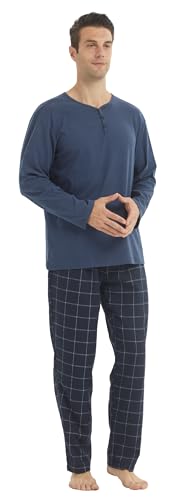 BEGIANT Pyjamas, herr, lång, tvådelad, vinter, Henley, långärmad skjorta, flanell, rutiga pyjamasbyxor med ficka, mjuk fleece, pyjamas, loungewear set, Marinblå rutig, XL