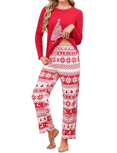 Reliwel Dampyjamas, lång, av bomull, rutig pyjamas för kvinnor, tvådelad, nattkläder, långärmad tröja och rutiga pyjamasbyxor med fickor, sovkläder, fritidsoverall för höst och vinter, Julröd, M