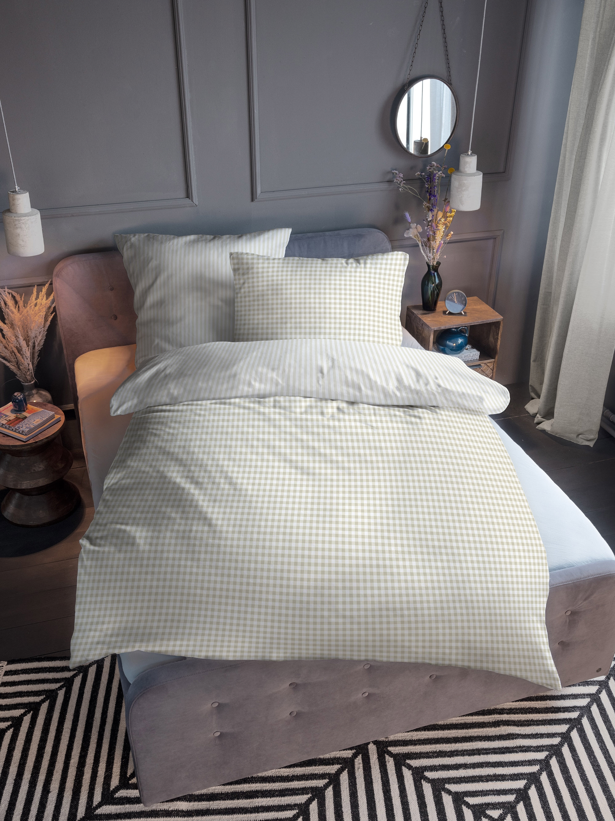 Rutiga sängkläder 140x200 cm - Randigt sängkläder i 100% bomull - Beige - Vändbar design - Tom Tailor