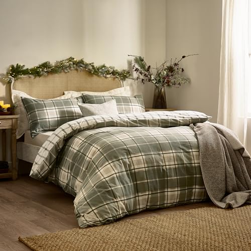 Wylder Nature Braemar rutiga sängkläder – mjuk borstad bomull vändbar design med knappstängning (grön/naturlig – dubbel)