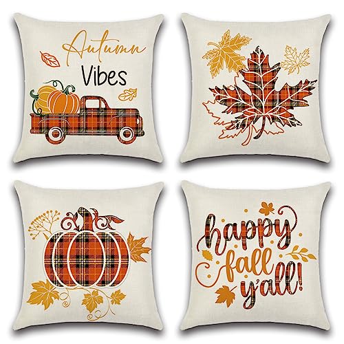 Artscope Buffalo Rutigt Kuddfodral Med Hösttema - Dekorativa Kuddar Med Pumpor, Lönnlöv, Lastbil För Soffa, Bil, Sovrum - 40 x 40 cm, 4 Stycken