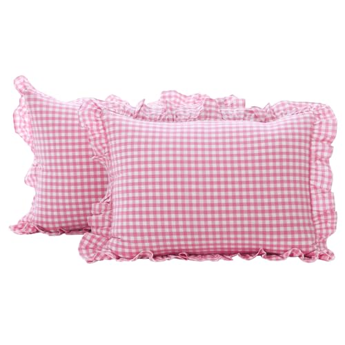 K MASANIJI 2-pack rosa och vitt rutigt kuddfodral med volang i standardstorlek, 100% tvättad bomull, rutigt örngott till flickig säng – 51 x 66 cm / 20 x 26 tum