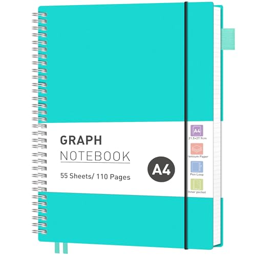 RETTACY Anteckningsbok, A4-format, rutigt papper, collegeblock med 55 ark/110 sidor, mjukt PVC-skydd, spiralbok med papper på 100 g/m², för skola, konferenser och som dagbok, 21,5 x 27,9 cm, turkos