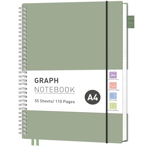 RETTACY Anteckningsbok, A4-format, rutigt papper, collegeblock med 55 ark/110 sidor, mjukt PVC-skydd, spiralbok med papper på 100 g/m², för skola, konferenser och som dagbok, 21,5 x 27,9 cm, grön