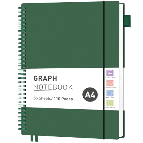 RETTACY Anteckningsbok, A4-format, rutigt papper, collegeblock med 55 ark/110 sidor, mjukt PVC-skydd, spiralbok med papper på 100 g/m², för skola, konferenser och som dagbok, 21,5 x 27,9 cm, mörkgrön