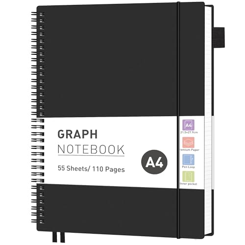 RETTACY Anteckningsbok, A4-format, rutigt papper, collegeblock med 55 ark/110 sidor, mjukt PVC-skydd, spiralbok med papper på 100 g/m², för skola, konferenser och som dagbok, 21,5 x 27,9 cm, svart