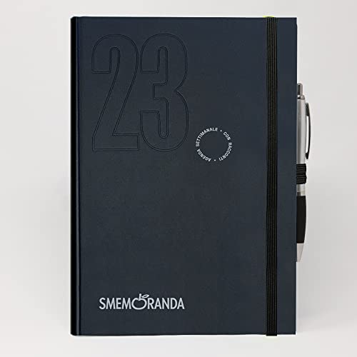 Smemoranda - Veckoagenda, 12 månader, januari-december 2023 - Rutigt papper, extra stor storlek 16,8 x 24 cm - penna ingår - svart färg