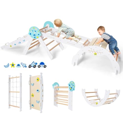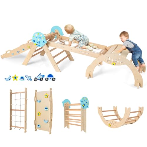 COSYLAND 8-i-1 Inomhus Klätterställning – Klättertriangel med Båge & Rutschkana – Hopfällbar Lekställning i Trä för Barn 18M–6År, Stor, Kalla Färger
