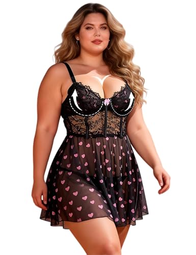 ohyeahlady Plus Size Miniklänning Dam Rygglös Kurvig Klänning Nattlinne Babydoll Underkläder Underkläder Sovkläder Pyjamas Morgonrock Underkläder med G-String, Svart, 3XL