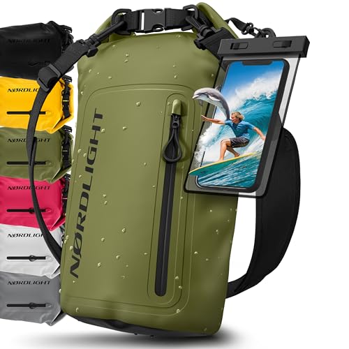 Nordlight Dry Bag Vattentät Väska med Mobilfodra+ Rullstängning, Axelrem | Drybag Vattentät Ryggsäck Packsäck Våtbag Packväska | Simning Strand Stå Upp Paddling Kanotpaddling - Olivgrön, 30 Liter