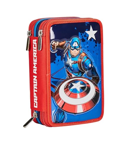 SEVEN Skolväska med 3 fack, Disney - Captain AMERIKA - LEGENDAY AVANGE, blå röd - pennhållare med flera fack med pennor, pennor och färger, ryggsäck tillbehör, skolryggsäck - pennfodral för barn,