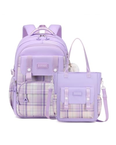 Tanou Ryggsäck skola flicka tonåringar, stor skolryggsäck set med skolaxelväska, rutmönster vardaglig dagryggsäck barn skolväska för flickor, 26 l, lila, mittelgroß (Backpack), klein (Crossbody Bag)
