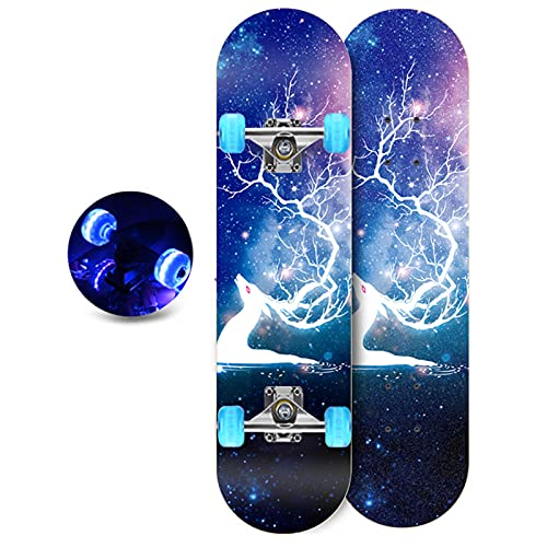 HSGAV 79 cm x 20 cm komplett skateboard, standard 7 lager kanadensisk lönn trädäck skateboard med PU blinkande hjul för barn tonåringar vuxna, med ryggsäck och pigment, justeringsverktyg, älg