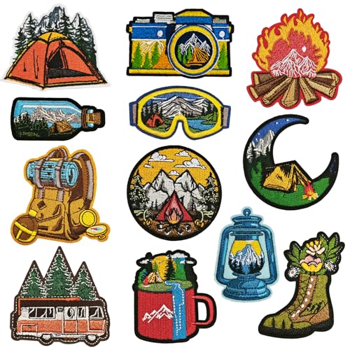 Qpout 12 st campingjärn på lappar, äventyr vandring utomhus natur landskap broderad dekorativ reparation applikation lapp klädkit ryggsäck jeans jackor keps hantverk