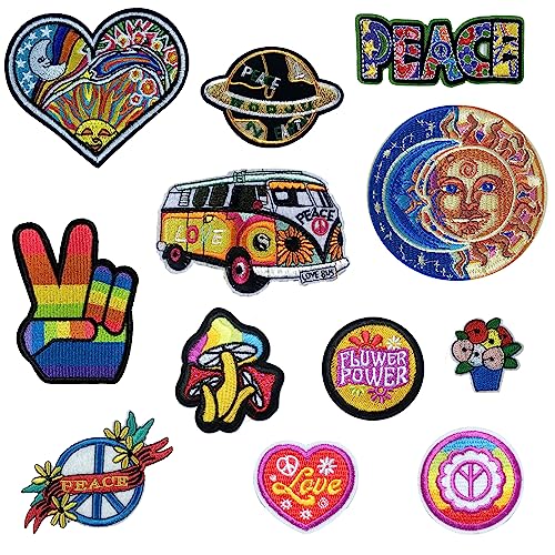 Qpout 12 delar hippie lappar stryk på vintage lappar fredsskylt reparation dekorativ lapp för kläder design ryggsäck jackor jeans skjorta gör-det-själv hantverk dekorationer