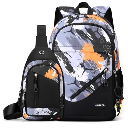 Amythe Skolryggsäck pojkar tonåringar 2 delar med slingväska män casual dagryggsäck, skolväskor-set för 9–18 år, stor kapacitet vattentät kamouflage ryggsäck skola flickor, orange, 8488# Orange