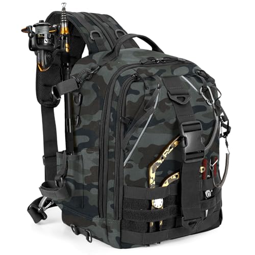 Jueachy Ryggsäck för fiskeredskap med spö och växellåda, lätt utomhus, vattentålig fiskeförvaringsväska, Svart kamouflage, 30L