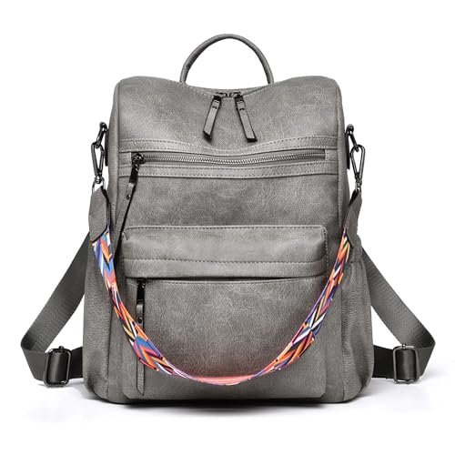 Damryggsäck handväska, mode läder designer kvinnor ryggsäck, konvertibel resa axelväska med färgglad rem (PU Grey)