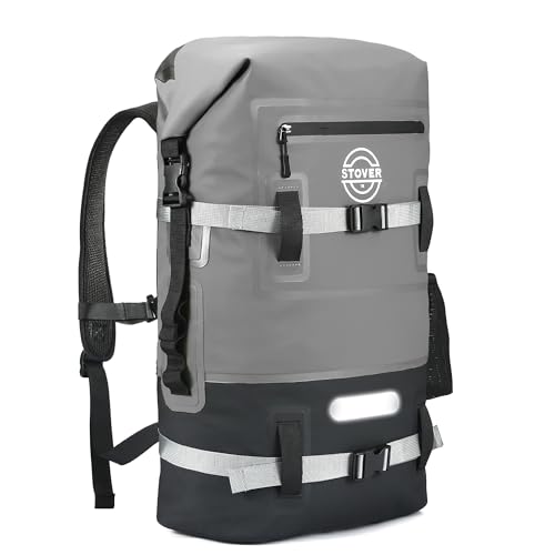 STOVER Vattentät ryggsäck slitstark Roll-Top stängning flytande torr väska med framficka vadderad bakpanel och reflekterande remsa, Grå, Torrväska ryggsäck