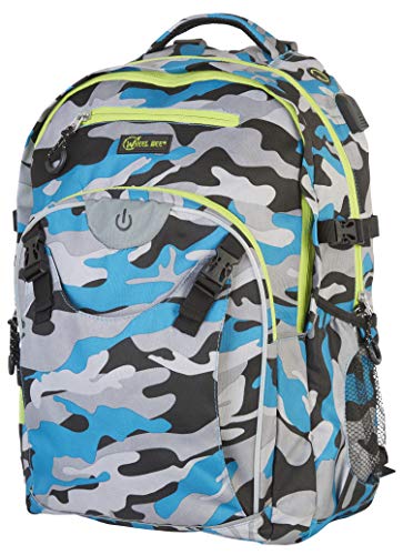 Wheel-Bee Generation Z Skolryggsäck, design: Blå kamouflage, LED-ljus för säkerhet och synlighet, trendig ryggsäck, USB-port, hörlursutgång, många fack, 950025