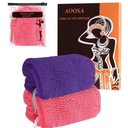 AOOSA 2 St. Afrikanska Nätsvampar med Knutar, Autentisk Ryggskrubb och Exfolierande Badsvamp, Lång Kroppsskrubb för Len Hud, Snabbtorkande Duschsvampar för Kvinnor och Män - Lila och Rosa