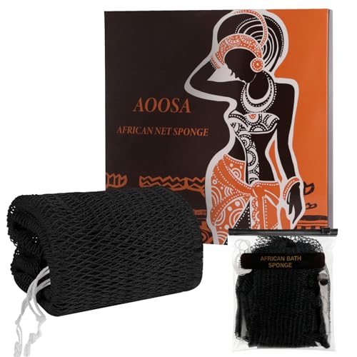 AOOSA Afrikansk Nätsvamp med Knutar, Autentisk Ryggskrubb och Exfolierande Badsvamp, Lång Kroppsskrubb för Mjukare Duschhud, Snabbtorkande Nätsvamp för Kvinnor och Män - Svart