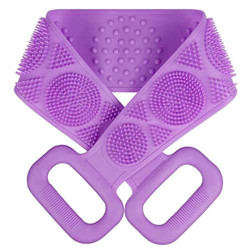 URAQT Kroppsborste Ryggskrubb, silikonbadduschborste för kvinnor och män, mjuk exfolierande kroppsskrubb med massagepartiklar, dubbelsidig användning för borttagning av smuts och massage, förlängd 70 cm (Lila)