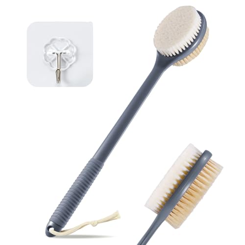 VANZAVANZU 43 cm ryggskrubbare för dusch, halkfritt långt handtag duschborste med mjuka och styva borst, exfolierande badborste för våt eller torr borstning (grå)
