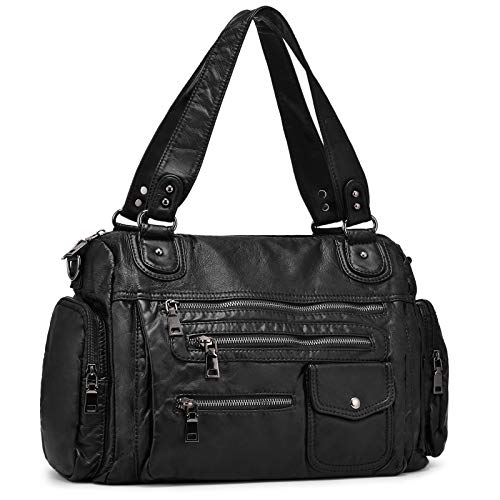 Damhandväska i mjukt syntetiskt läder, tvättat med flera fickor, elegant och rymlig axelväska, handväska, tote tote, svart-2281, M, Svart-2281, M