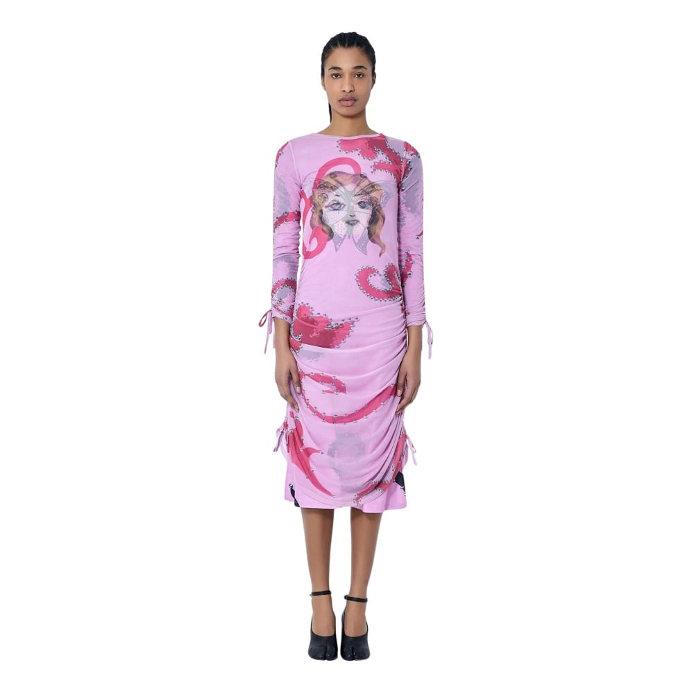 Chopova Lowena, Klänningar , Dam, L, Polyester, Tryckt Mesh Rynkad Midi Klänning