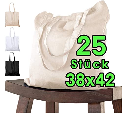 25-pack otryckta bomullspåsar 38 x 42 cm långa handtag av säckväv – Oeko-Tex certifierad naturlig