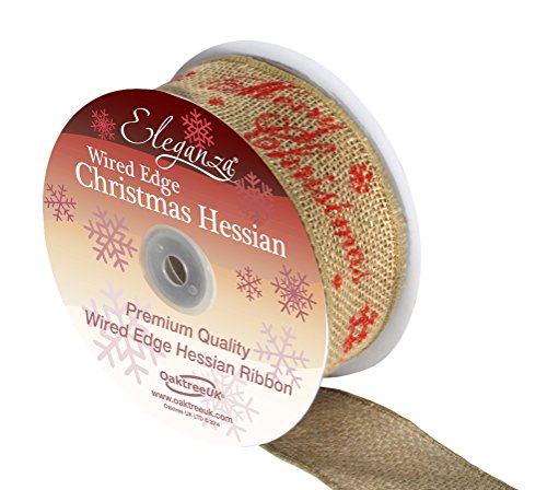 Naturlig hessian säckväv god jul snöflinga band trådbunden kant rött tryck x 1 meter