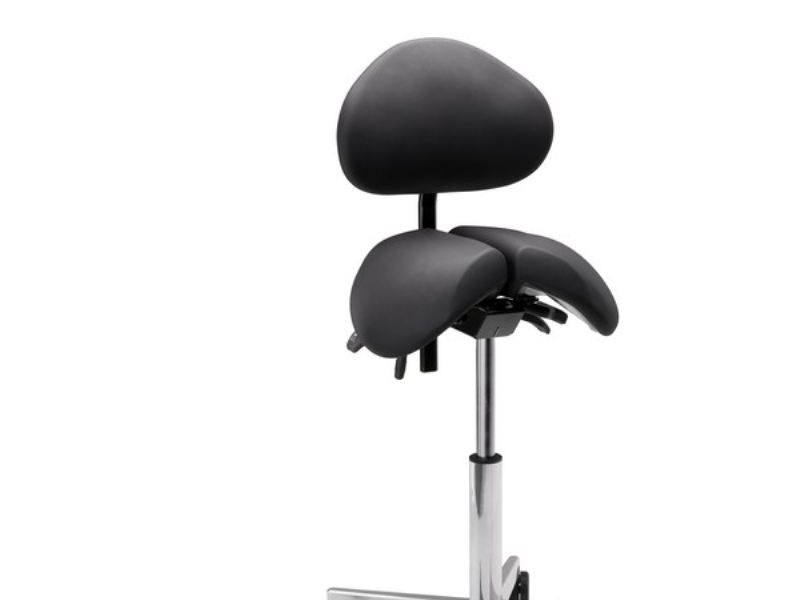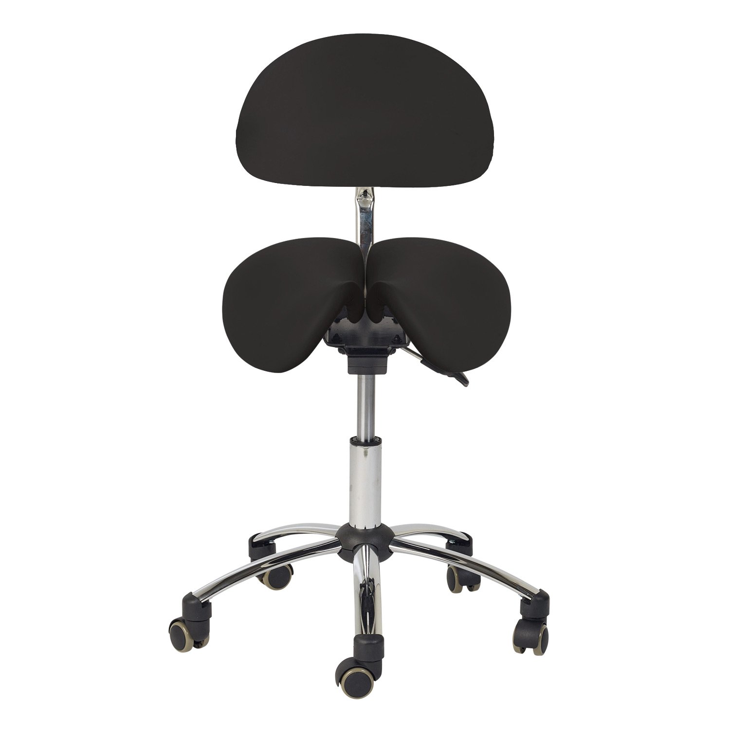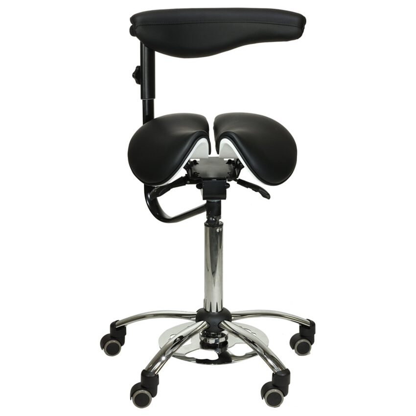 Twin sadelstol med delad sits, rörligt ryggstöd och fotreglage