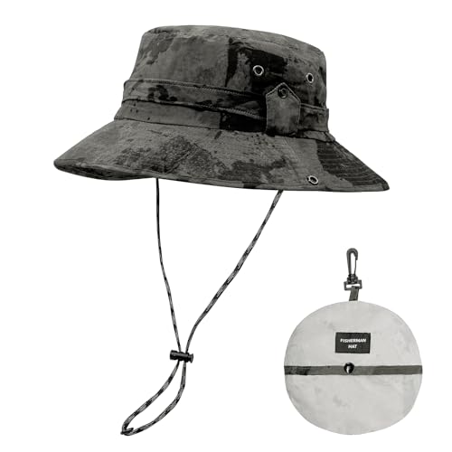 YAMEIZE Vattentät UPF50 + fiskarhatt sträng – för kvinnor och män, safari-hatt, UV-skydd med justerbar rem, fiskehatt, strand, vandring, grå kamouflage, one size