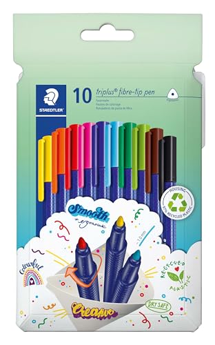STAEDTLER Fiberpenna triplus färg, ergonomisk trekantform, stabil, trycksäker 1,00 mm spets, DRY SAFE, PP-skaft, lock med andningsluftkanal, 10 fiberpennor i en kartong örngott, 323 C10