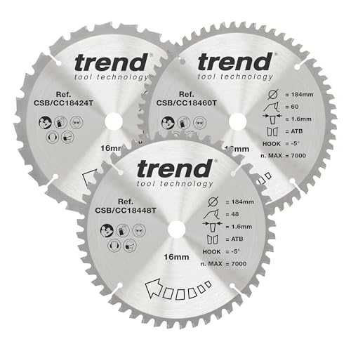 Trend CraftPro trippelpaket med korsskärande TCT-sågblad, 184 mm x 16 mm borr, 24 och 48 och 60 tänder, perfekt för trend T18 och Dewalt DCS365 geringssågar, CSB/CC184/3PK