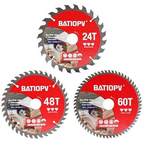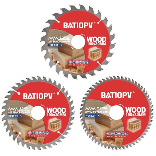 BATIOPV Cirkelsågblad 190 x 30 mm (24/48/60 tänder) 3 delar (för trä, spånplattor, plywood, lövträ, etc.) | Kompatibel med Dewalt Makita Bosch einhell, sågblad för träskärningar