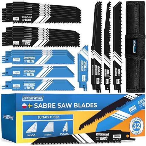 EFFEKTWERK Sabelsågblad set – 32 stycken – sågblad tigersåg för trä metall plast – sabelsågblad trä och sticksågblad metall – ersättningsblad i förvaringsväska