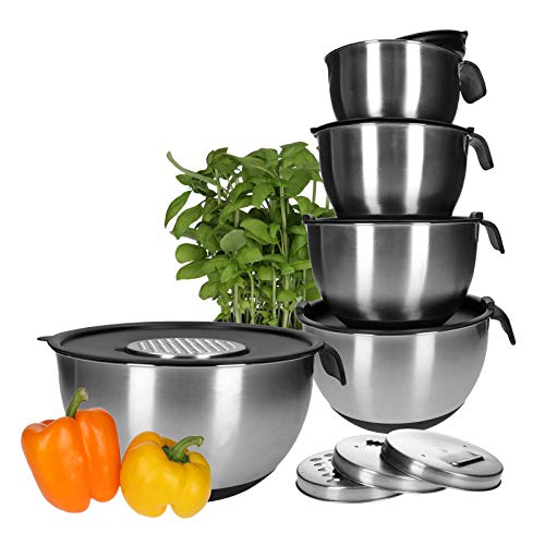 TALK-POINT Rostfritt stål blandningsskål, salladsskål, serveringsskål med handtag och hällpip | 18/10 rostfritt stål, inklusive lock och 4 grönsaksrivare, inre skala, silikonbotten (15 stycken med handtag).