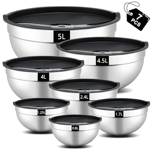 hunnycook blandningsskål 7-delat set, rostfritt stål salladsskål med lock, stapelbar blandningsskålsats, diskmaskinssäker, 5 L, 4,5 L, 4 L, 2,4 L, 1,7 L, 1,25 l, 0,8 l, blandning