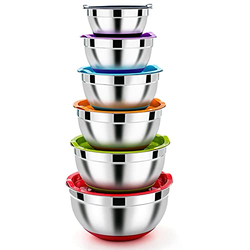 Homikit blandningsskålsset, rostfritt stål skål salladsskål set om 6 med lufttätt lock och silikonbotten, stapelbar, diskmaskinssäker, 4,6 l/2,8 l/2,5 l/1,6 l/1,2 l/0,7 l