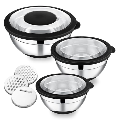 Herogo salladsskål uppsättning av 3, rostfritt stål blandskål med lufttäta lock, 3 rivjärn, skålar för blandning, bakning, servering, förvaring, perfekt för kök och matberedning, svart